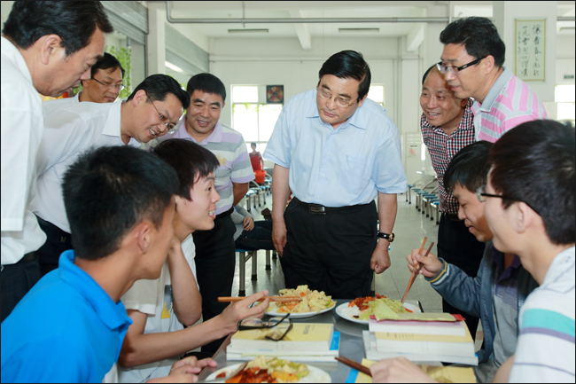 校领导分别深入到各个学生食堂的操作间、洗消间、贮藏室、学生售饭窗口等,对食堂的卫生安全情况、饭菜的烹制、价格及种类、餐具的消毒及餐厅的环境、食品采购和供应渠道等各方面情况进行了全面的查访。校领导详细了解学生们的就餐情况、每月的饮食费用、对食堂的满意程度等。勉励他们在就餐时既要保证身体成长需要,又要积极响应国家和学校关于“光盘行动”的号召,厉行节约,避免浪费。同时,要理解后勤服务工作,尊重炊事员的辛勤劳动,通过正当渠道反映对饮食工作的意见和建议。